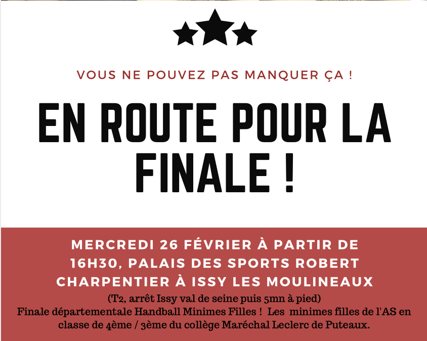 Vous ne pouvez pas manquer ça ! Mercredi 26 février à partir de 16h30, palais des sports Robert Charpentier à Issy les Moulineaux : Finale départementale Handball Minimes Filles ! Les minimes filles de l'AS en classe de 4ème / 3ème du collège Maréchal Leclerc de Puteaux.